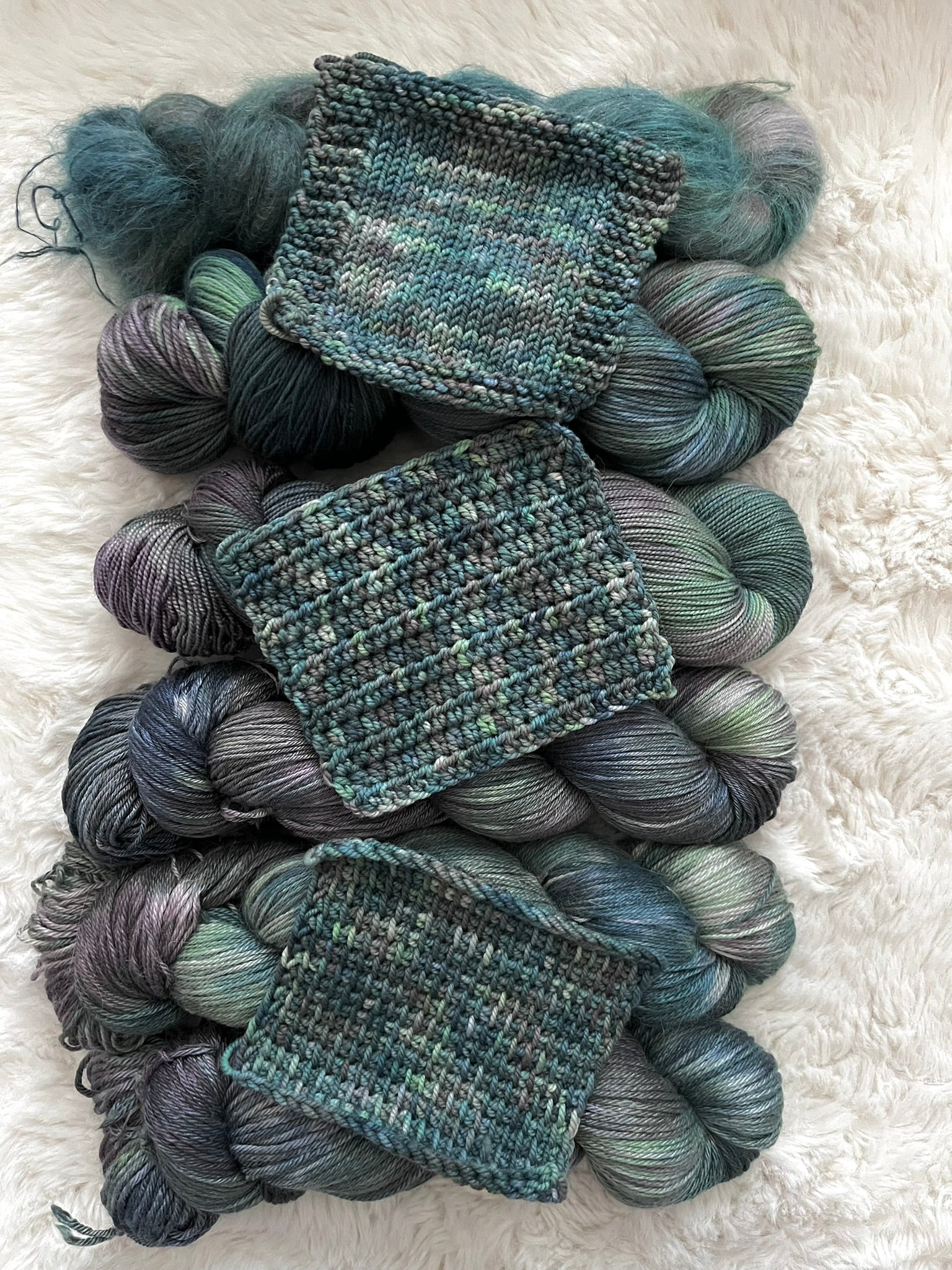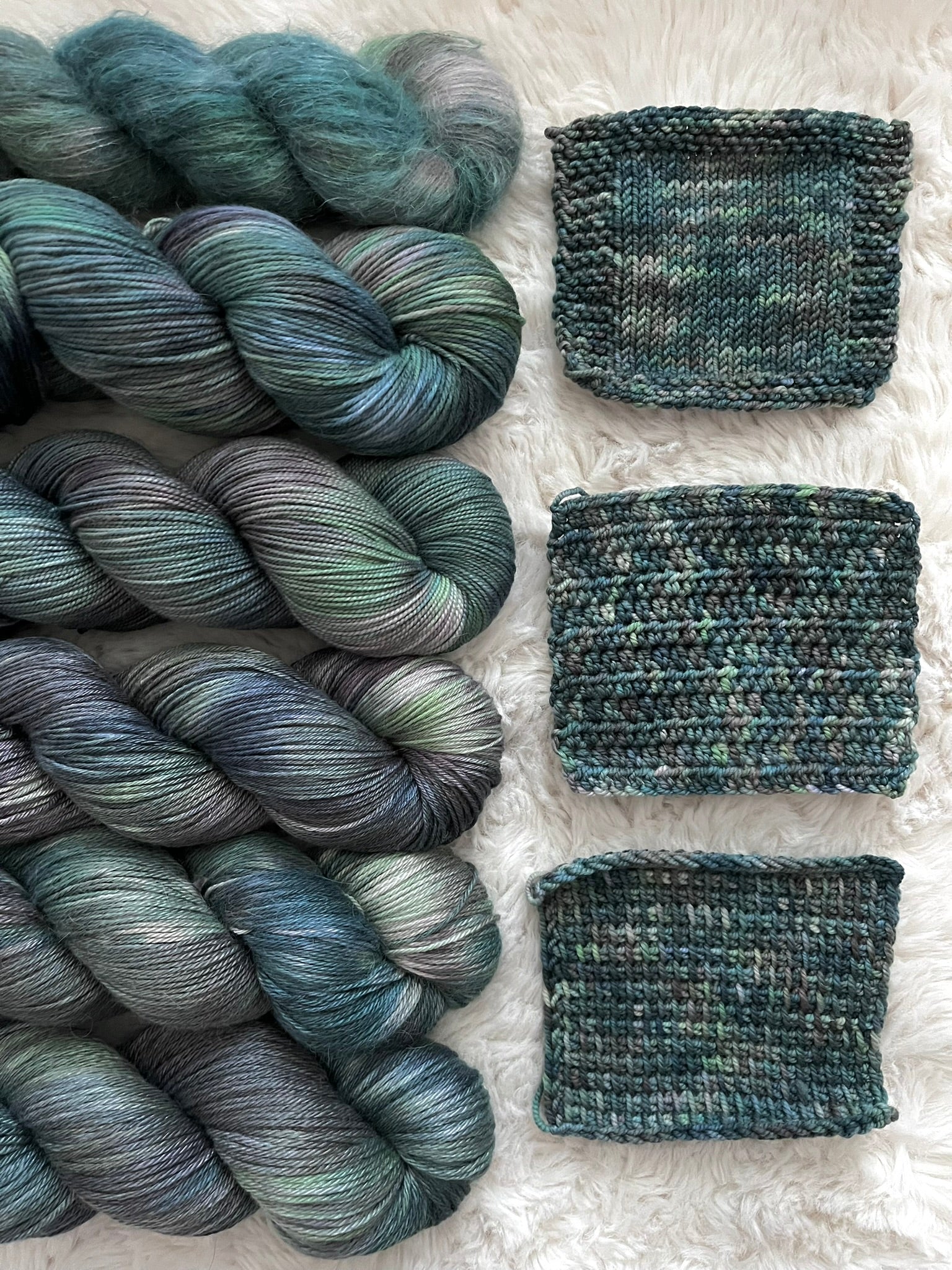 The star of the show, this colorway was inspired by the Northern Lights I was fortunate enough to see during my trip to Fairbanks last winter. Aurora Borealis a blend of navy blue, dark gray, forest green, and light green!